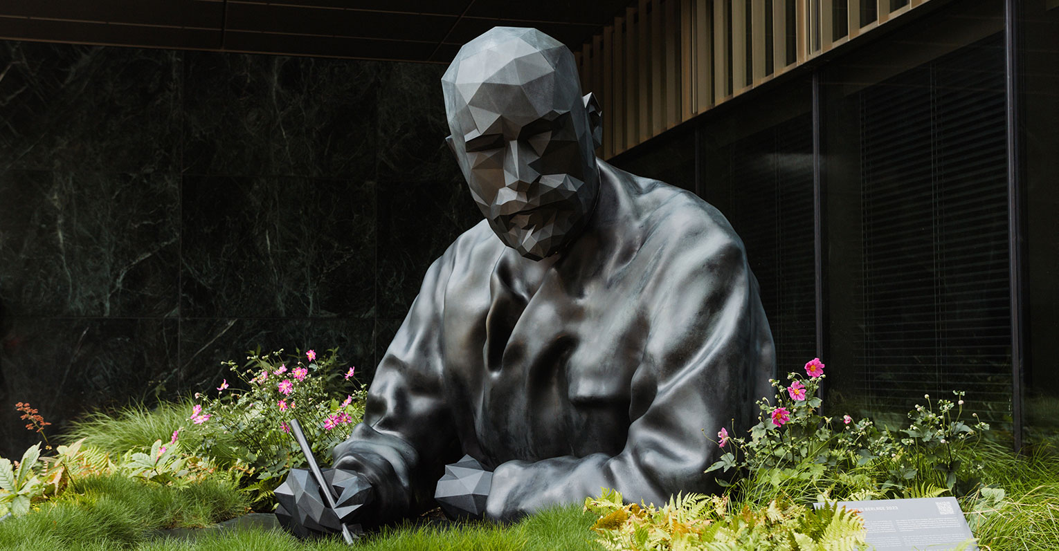 A state-of-the-art office building designed by architecture firm OMA has been built on the green Apollolaan in Amsterdam-Zuid. It is a design with a dual character. With fine brickwork, it’s a suitable addition to a neighbourhood that prides itself on its rich history. The side of the building overlooking the Apollolaan is characterised by a glass facade that provides an open, inviting appearance. The main entrance is located on the corner, where you’ll be greeted by an imposing sculpture of Berlage. Walk a little further past the entrance and you will see Tracey Emin’s beautiful Led artwork behind the windows of the entrance to the garage. Once inside the lobby, your attention will immediately be grabbed by Studio Job’s Lady Liberty.